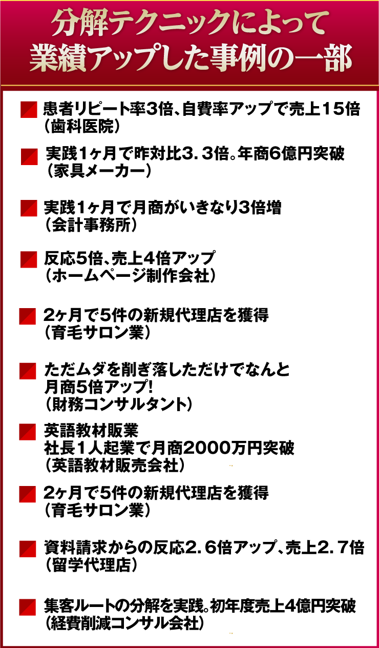 事実、僕のクライアントのほとんどがこの分解テクニックを実践しており、その中には3倍どころか10倍以上の売上アップに成功しているケースもあります。