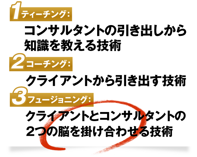 そして、フュージョニングは、コンサルタントとクライアントの両方の脳を200%ドライブさせ、それによって、目の前のクライアントにとっての最適解を作るという手法です。