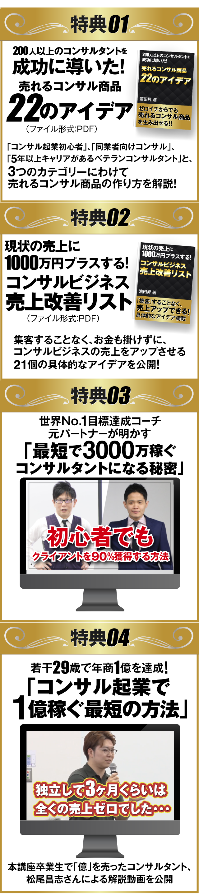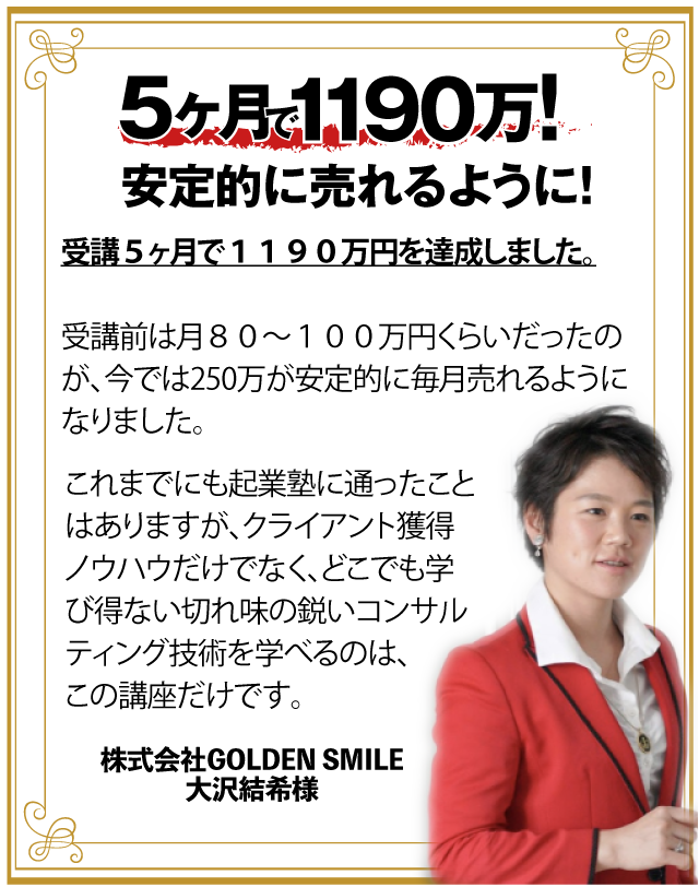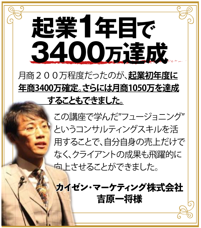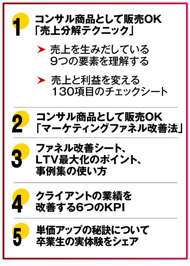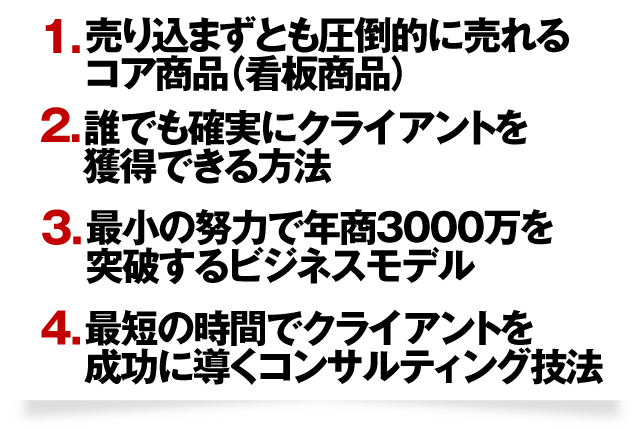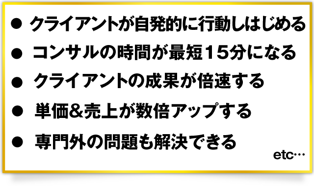 つまり、あなたはその業績アップノウハウを“ご自身のコンサル商品”として販売でき、かつ、クライアントの指導にも使えるということです。