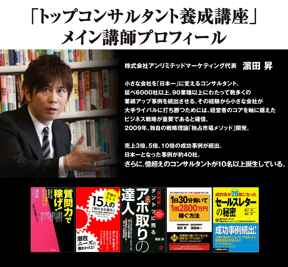 その経験から小さな会社が大手ライバルに打ち勝つためには、経営者のコアを軸に据えたビジネス戦略が重要であると確信。2009年、独自の戦略理論「独占市場メソッド」開発。