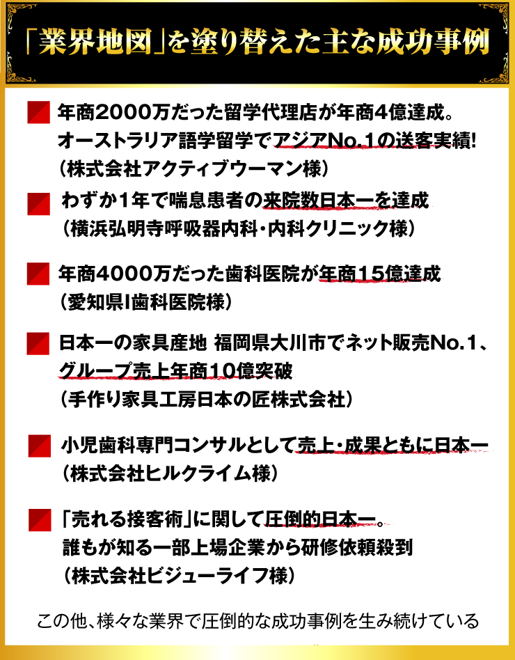 売上3倍、5倍、10倍の成功事例が続出。日本一となった事例が約40社。 さらに、億超えのコンサルタントが10名以上誕生している。