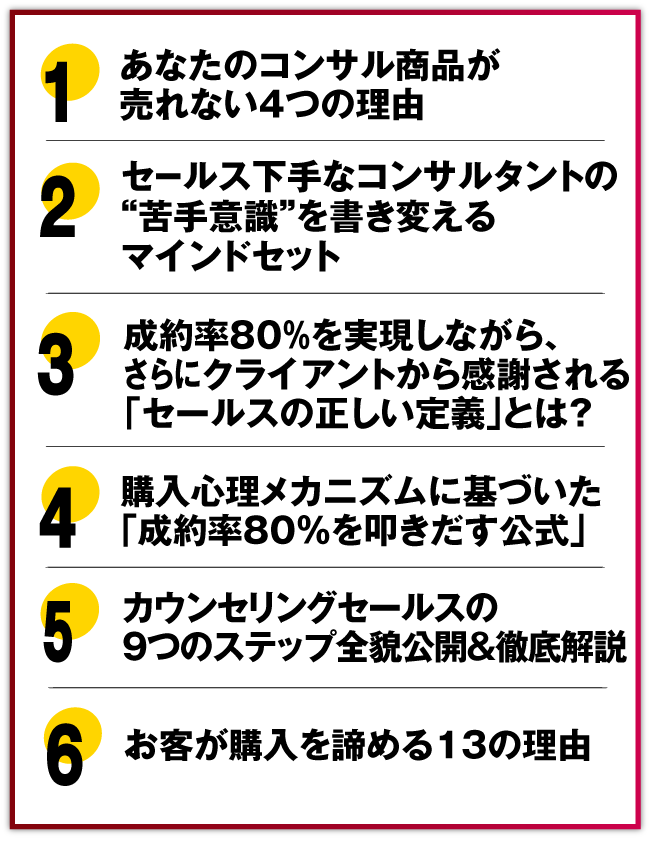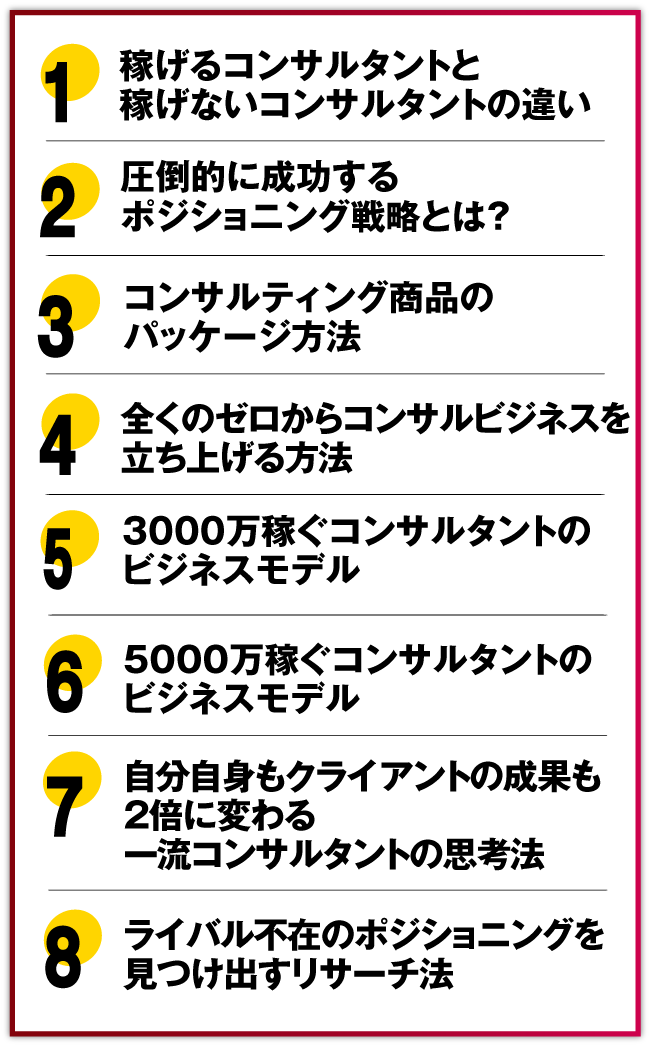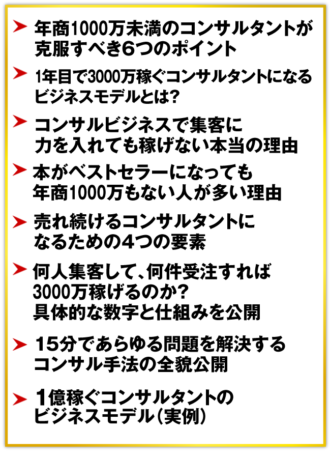 この内容は他では絶対に知ることができないコンサルビジネスの成功の秘訣です。