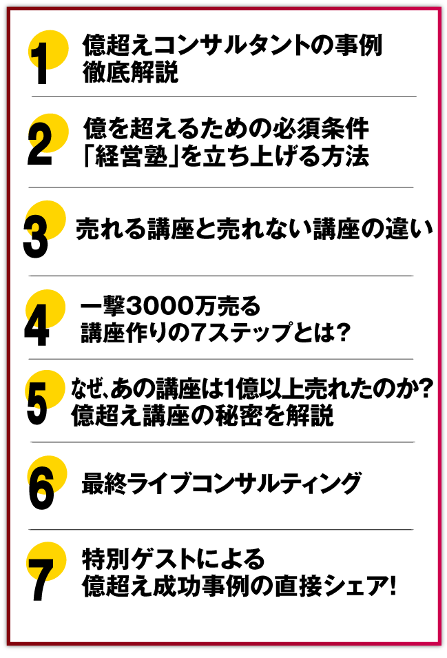 また、もし、すでに年収3000万をクリアしているのであれば、その先のレベル年商1億を超える方法論もお伝えします。具体的には・・・